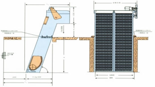 鏈條回轉(zhuǎn)式多耙平面格柵除污機(jī)是在消化吸收同類產(chǎn)品基礎(chǔ)上進(jìn)行開發(fā)研制的新機(jī)型,它由多塊齒耙(一般4-8塊)按間隔均勻分布在牽引環(huán)鏈上,組成多耙回轉(zhuǎn)體,齒耙從攔污柵條后方下行,通過(guò)水下鏈輪換向后運(yùn)行至柵條前部,自下而上地耙除柵條截留的污物,沿?fù)醢鍝浦列对?,卸入污物貯桶或通過(guò)輸送機(jī)、壓榨機(jī)等附屬設(shè)備外排。