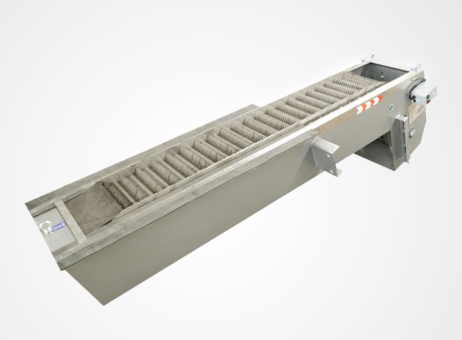 自清式格柵除污機(jī)主要由機(jī)架、驅(qū)動(dòng)裝置、齒耙及傳動(dòng)鏈條組成。由ABS工程塑料、尼龍6、尼龍1010或不銹鋼制成形狀的耙齒按次序裝配在齒耙軸上,形成一條封閉的耙齒鏈。水下柵片(耙齒)截留污物沿軌上行,當(dāng)達(dá)到項(xiàng)部時(shí),因彎軌和齒輪的導(dǎo)向作用,使相鄰耙齒間產(chǎn)生相對(duì)推移運(yùn)動(dòng),將污物外推,依自重卸入污物盛器內(nèi)。同時(shí)轉(zhuǎn)刷將耙齒上微量殘留污物剔除干凈。